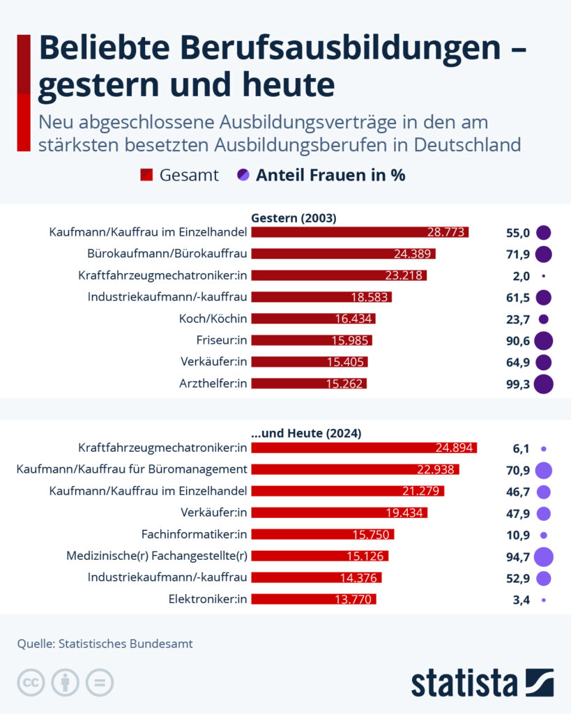 Kauffrau/Kaufmann im Einzelhandel war im Jahr 2003 nach Anzahl der neu abgeschlossenen Ausbildungsverträge der beliebteste Ausbildungsberuf in Deutschland. Heute liegt die Ausbildung zum Beruf des Kraftfahrzeugmechatronikers auf dem ersten Platz. Das zeigt die Statista-Grafik auf Basis von Daten des Statistischen Bundesamtes. Die Ausbildung zum Bürokaufmann bzw. zur Bürokauffrau (heute: Kaufmann/Kauffrau für Büromanagement) liegt damals wie heute auf Platz zwei. Die Ausbildung zum bzw. zur Verkäufer:in liegt heute auf Platz vier (19.434 neu abgeschlossene Ausbildungsverträge) – 2003 reichte es mit rund 15.000 neuen Verträgen nur für Platz sieben. Neu hinzugekommen in der Top-8-Liste sind die Ausbildungen zum bzw. zur Fachinformatiker/in und Elektroniker/in. Koch/Köchin und der Friseurberuf ist in der Beliebtheit gesunken und hat es nicht mehr in die Grafik geschafft.